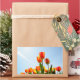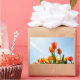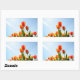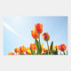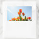 Rectangular photo sticker with flowers consisting of orange and red tulips seen from a low point of view against a blue sky.