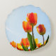 Round photo throw pillow cushion with flowers consisting of orange and red tulips seen from a low point of view against a blue sky.