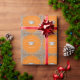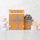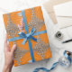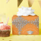 This modern design features a graduation hat and confetti in silver on a background of Orange with white text.