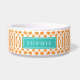 Cute customised cat or dog food bowl with an orange trellis pattern and rectangle frame placeholder for your beloved pet's name.