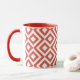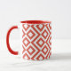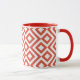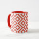 This bold orange and white geometric pattern is an original ornamental design. White meanders angle around orange diamonds containing white diamonds. Orange zigzags provide subtle separation between the winding paths.