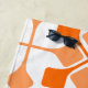 This towel set has a mid-century modern design of arrows in two shades of orange on a field of white.