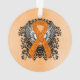 Orange ribbon with angel wings and filigree pattern. The orange ribbon stands for Multiple Sclerosis Awareness in March, Self Injury Awareness in March, Melanoma Awareness in May, Skin Cancer Awareness in May, Leukaemia Awareness in September, Cultural Diversity Awareness in October, Hunger Awareness in October, Lupus Awareness in October, RSD/CRPS in November, as well as Feral Cats Awareness, Agent Orange Awareness, Motorcycle Safety Awareness, and Racial Tolerance Awareness.