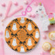 Set the party table with coordinated paper plates featuring a pattern of cheerful, smiling ghosts and preppy black ribbon bows on an orange background. Customised text helps you personalise these plates to fit your event making them the perfect for Halloween parties or Baby Boo is Almost Due themed October baby showers, these little ghosts are sure to bring a smile to your guests.