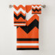 This lovely bathroom towel and washcloth set features a beautiful orange, black, and white zig zag design.