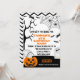 Looking for a striking orange, black and white Halloween children's birthday invitation? This design is sure to set the scene for a spooktacular upcoming Autumn or fall Halloween birthday party. It features some tomb heads, pumpkin, bats, spiders, cobwebs and spooky tree.