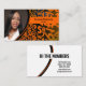 A orange and black numbers background on this design features a photo placeholder on the left with template name on the right. The back includes a coordinated design and colours with text fields for the business name and details. Replace the placeholder photo with your vertical format photograph. Fill in the template fields or edit using the design tool to select a font style, size, and colour you like. The placeholder photo is courtesy pixabay.com.