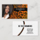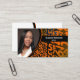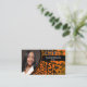 A orange and black numbers background on this design features a photo placeholder on the left with template name on the right. The back includes a coordinated design and colours with text fields for the business name and details. Replace the placeholder photo with your vertical format photograph. Fill in the template fields or edit using the design tool to select a font style, size, and colour you like. The placeholder photo is courtesy pixabay.com.