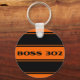 An orange background with black racing stripes and text that says BOSS 302 is the focus of this high quality key chain. Step on the gas and go fast! In the muscle car world, size does matter.