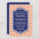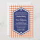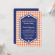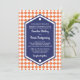Wedding invitation featuring a chequered pattern in white and orange, and the wedding wording inside a blue label.