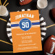 Royal Blue Stripes and an orange background highlight this sport themed birthday party invitation. The design includes a sports jersey circle and stripes with an area to highlight the Birthday Boy's Name and Age. Include any party information and choose between a print or download option.