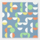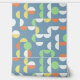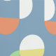 This design showcases a modern geometric pattern with circles and half-circles in shades of mint green, orange, light yellow, and white against a slate blue backdrop. It's an elegant and stylish design that embodies eclectic minimalism, perfect for artistic interior designers, decor enthusiasts, trendsetters, and fans of vintage retro or abstract digital geometric motifs. This ornate yet funky hipster pattern is versatile, and available on a variety of contemporary home decor items, making it suitable for enhancing the ambiance of spaces such as master or children's bedrooms, kitchens, nurseries, living rooms, woman caves, college dorms, condos, studios, or apartments.