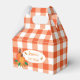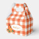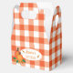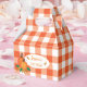 A set of favour boxes with a classic orange and white buffalo check design and two pumpkins . Ideal for any fall event you might be organising such as baby showers ,  birthdays , a group event , a Halloween party , a Thanksgiving gathering , a retirement celebration and so much more . Replace the text with your own .