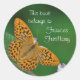 A photo of an orange and black silver washed fritillary butterfly on a green background - a sticker to use as a bookplate and customisable with your own name. The text says "this book belongs to" but can easily be changed to "from the library of" etc.