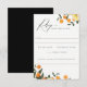 Rustic watercolor orange citrus fruit, greenery and floral, wedding RSVP cards with food allergy note. Back of card features solid black colour.