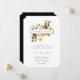 Chic and modern typography design, wedding invitation that features watercolor botanical bouquet of citrus orange fruit and floral. Back of invitation features solid black colour.