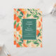 A wedding invitation with a retro vibe. A pattern composed of sliced oranges, whole oranges, green leaves and white blossoms.
