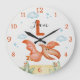 Add a playful touch to your child’s room with this adorable orange dinosaur nursery wall clock. Featuring a friendly flying pterodactyl surrounded by clouds and stars, this watercolor-style clock brings color and joy to any dinosaur-themed baby room or kids’ space.