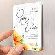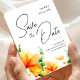 Orange bright preppy romantic templates with orange wildflowers and leaves of eucalyptus twig on watercolor background. Pastel wildflower rustic fall wedding save the date magnets. Minimalist wedding save the date magnet invitation cards with stylish decor orange herbs blossom bloom composing.