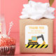 A thank you sticker for decorating your party favours and gifts! It features a cute orange and grey excavator, a yellow and black slanted stripes pattern for background. Great for a construction theme kids birthday party!