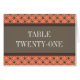 Trendy and chic Fancy Lattice Table Number Card featuring a stylish circle and diamond studded pattern over a vibrant nectarine orange background with a broad two-toned brown border. This elegant table card is perfect for a modern wedding. Easy to customise, simply add the appropriate table number(s) in the text field provided. Click "Customise It" to find more personalisation options.