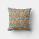 A Throw Pillow or Cushion with an all-over pattern of Red, Orange and Yellow flowers on a bright Turquoise background on one side and White Polkas on Turquoise on the other, from a handpainted paper collage by Judy Adamson.