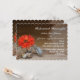 Rehearsal Dinner invitation flat card. Rustic wedding look you will enjoy with the bright orange flower in the glass Mason jar. The jar is filled partially with small rocks. The glass jar decoration sits on a rustic wooden table. Ideal for any season. Personalise this with your information.