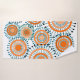This towel set has a design of rings and circles in shades of orange with teal lines crossing behind them forming flowers on a field of white.