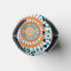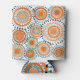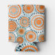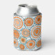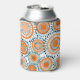 This can cooler has a design of rings and circles in shades of orange with teal lines crossing behind them forming flowers on a field of white.
