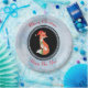 and across his chest. Merry Christmas and Happy new year written along the edge of the plate. The background is vintage looking blue grey colour with a faded dot pattern along the top and bottom.
