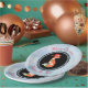 Paper plates with a cute orange fox illustration inside a black circlel. He is wearing a red santa hat and has festive green decorative accents on his tail