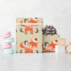 A charming roll of christmas wrapping paper with a retro flair. An illustration of a cute orange fox, wearing a red santa hat surrounded by christmas holly decorations. A sweet little festive forest animal. Set on a neutral toned tan background.