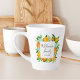 Sip in style with this botanical latte mug featuring orange fruits and flowers in a watercolor floral frame. A modern elegant summer gift with customisable calligraphy script! Perfect for housewarmings or summer weddings.