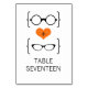 Quirky and chic Geeky Glasses Wedding Table Card featuring an orange heart flanked by two pairs of geeky eyeglasses, a manly pair and a girly pair representing the groom and bride. This offbeat but sophisticated table number card is perfect for your nerdy wedding! Easy to customise, simply add the appropriate table number(s) in the text fields provided. Click on the "Customise It" button to find additional personalisation options.