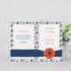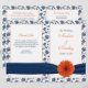 Orange gerbera daisy (gerber daisy), navy blue and white floral damask and ribbon personalised wedding program. The text is all fully customisable. The program itself is intended to be folded down the middle when you receive it. You can change the text using the personalise option. For more extensive changes to the program, including changing the font, font colour, font size, or text placement, choose the "customise it" option. This is a great wedding program for a summer or fall / autumn wedding with a gerbera daisy theme. The colours are bright orange, navy or marine blue, and white. Elegant and cheerful. This program is currently customised for a wedding, but would also work great for an anniversary party program (renewal of vows perhaps) or a church bulletin. All you need to do is change the wording. NOTE: This invitation is a flat printed design without any 3D embellishments.