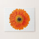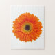 A beautiful bloom of an orange gerbera daisy flower with a brown centre on a white background