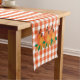 A pretty fall table runner with a classic orange and white Gingham pattern and some pumpkins. It can be for everyday use , to celebrate Halloween or Thanksgiving . Also available with a black and white Gingham pattern if you prefer .