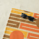 This beach towel has a mid-century modern design of repeating rectangles in orange, gold, and brown with circles layered on top.