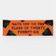 Creative class of 25 grad party banner featuring black and gold graduation caps and funny congratulations design on orange background.