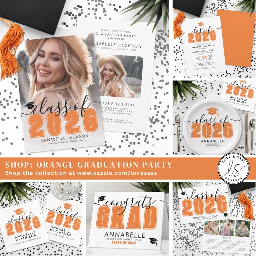Celebrate this special milestone with a stylish and timeless graduation card. The front features “Congrats Grad” in a bold orange paired with classic black and white typography, blending elegant script with strong lettering for a vibrant, celebratory look. Below, there’s space to personalise the card with the graduate’s name, school, and “Class of 2026” (or any year), turning it into a meaningful keepsake. Two graduation cap icons add a clean, festive finishing touch.