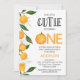 Cute our little cutie themed first birthday invitation in a modern design featuring a row of foliage and oranges on the left hand side of the design. This our little cutie 1st birthday invitation is a sweet way to invite guests to a cutie themed first birthday party.