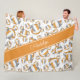 This cool volleyball team colours fleece blanket for girls features a pattern of varied size stylised orange, grey and white volleyballs turned every which way overlying a volleyball net detail graphic - the volleyballs' orange & grey panels are blended with an artsy, girly floral pattern - personalise her name in a sophisticated handwritten font on a bold, angled, full width orange colour strip - background and name strip colours are customisable - by katz_d_zynes