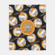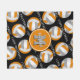 This sporty volleyball themed fleece blanket features a mirrored pattern of volleyballs with orange, grey and white panels and the sporty font text "I love volleyball" in grey that stretches between the angled rows of volleyballs - athlete name and monogram can be personalised on the large overlying circle pendant - background is customisable black - easily delete the "I love volleyball" text lines, if desired, or replace the monogram with the player's varsity letter or jersey number - by katz_d_zynes