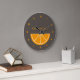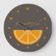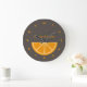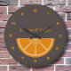 A brown wall clock with an orange half-slice and customisable text. It could be used for home or office decoration. You could also make a fresh birthday gift to your best friend!