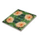 The original pattern on this small Ceramic Tile was made from an original photograph by HomeWare. The orange hibiscus flower we see in the photo is peeking out from among some green fern fronds in a lovely garden. The flower is in full bloom, with its ruffled edges standing out from the background of ferns. The shape of the flower is like a trumpet, curving outward, with red dots on top of yellow stems in the centre of the bloom. The photo is a closeup showing the detail in the flower petals of this peach coloured beauty.
