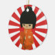 Hand drawn Cute kokeshi doll in Orange floral dress on a red and white rising sun background. Great gift for any lover of japanese inspired kawaii designs or collectors of kokeshi dolls