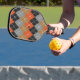 Personalised pickleball paddle Orange Light Grey Tan Off Black Argyle with white stitching. The argyle pattern has long been recognised as a classic design that has stood the test of time. The repeated diamond-shaped pattern evokes a sense of sophistication and elegance, adding a touch of refinement to pickleball attire and accessories. The symmetry and precision of the pattern also align with the sometimes meticulous angles and shots of the sport of pickleball. Additionally, the combination of bold and contrasting colours within the argyle design creates visual interest and makes a statement on the pickleball court. Overall, the argyle pattern as timeless charm, aesthetic appeal, and ability to add a touch of style and personality to any pickleball gear. Colourful many light grey, tan, orange, off black, with white stitching argyle pickleball-themed gift for your pickleball-loving mum, dad, uncle, aunt, brother, sister, neighbour, grandpa, grandma, husband, wife, friend, or work colleague who won't stop talking about pickleball.
