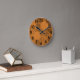 This wall clock has a mid-century modern design of black vertical lines with circles scattered on top on a field of orange.