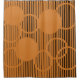 This shower curtain has a mid-century modern design of black vertical lines with circles scattered on top on a field of orange.