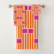 This towel set has a mid-century modern design of orange vertical lines with pink rectangles above repeated over the design.